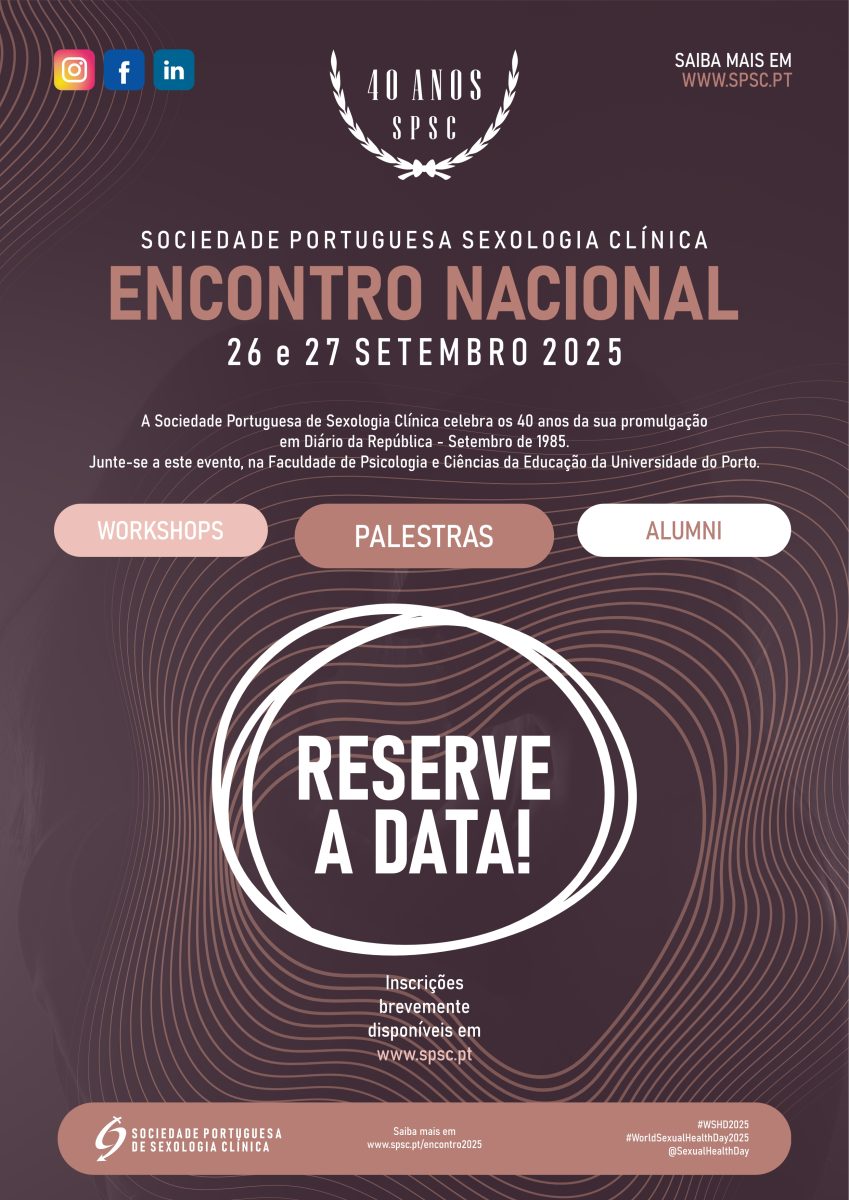 Como já vai sendo tradição, a Sociedade Portuguesa de Sexologia Clínica, organiza, nos dias 26 e 27 de Setembro de 2025, o seu Encontro Nacional, este ano, comemorando com muito orgulho e emoção os 40 anos da sua fundação.
